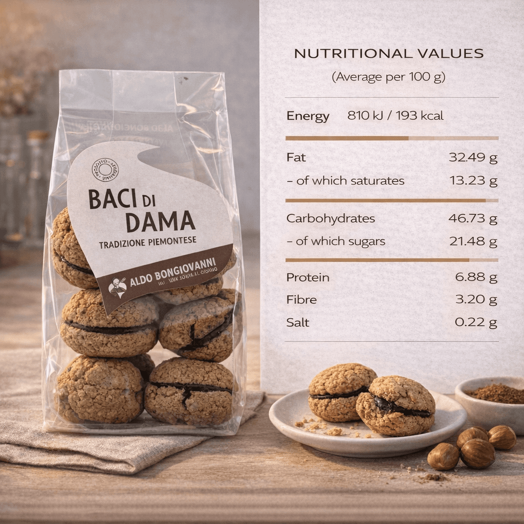 Ogni biscotto è il risultato di una lavorazione artigianale attenta, che esalta la qualità delle materie prime. La scelta consapevole di ingredienti come la farina di nocciole e il pregiato sale rosa dell'Himalaya valorizza ogni morso, rendendo i Baci di Dama un prodotto esclusivo nel panorama dei dolci senza glutine.
