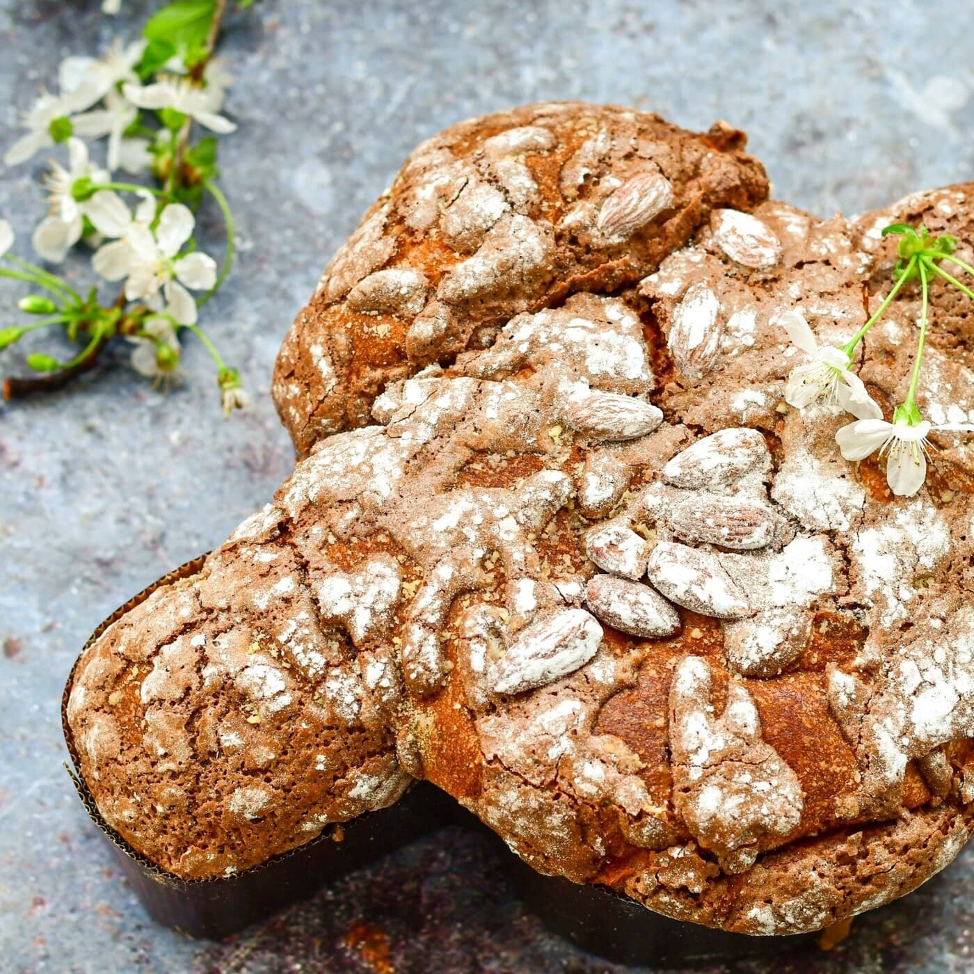 La Dolce Pasqua offre una consistenza soffice e ben alveolata grazie all'uso di lievito madre di riso e un ricco mix di farine alternative. Il vino moscato spumante del Ciabot, insieme alla qualità degli ingredienti, conferisce un profilo aromatico complesso che arricchisce l'impasto con note fruttate e floreali. La superficie leggermente dorata invita alla degustazione.