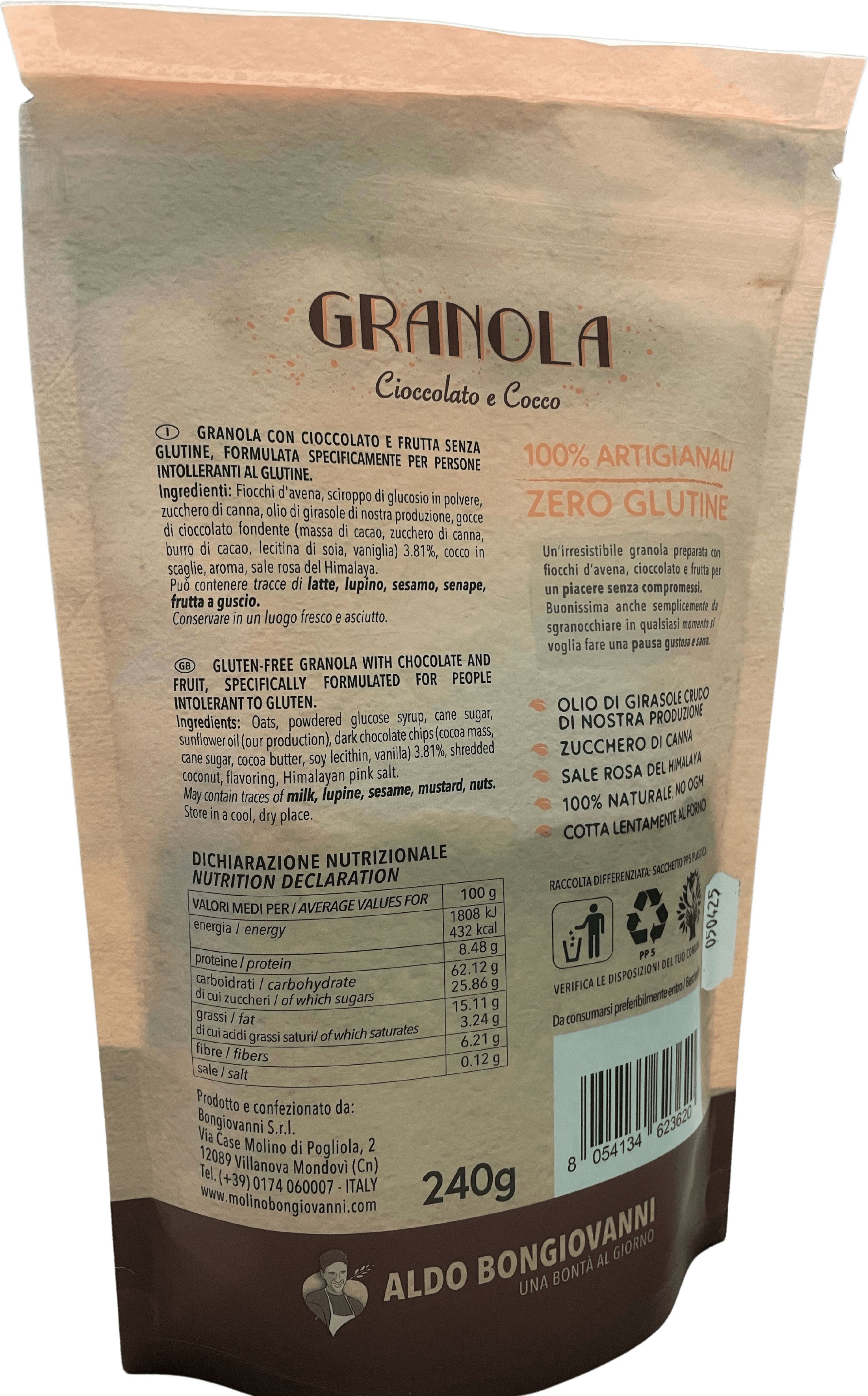 Realizzata seguendo un processo produttivo meticoloso che esalta le proprietà naturali degli ingredienti. L'attenzione al dettaglio garantisce che ogni confezione mantenga la freschezza e la qualità attesa. Il laboratorio di Aldo Bongiovanni si distingue per l'approccio artigianale, che unisce tradizione e innovazione, garantendo un prodotto non solo sano ma anche di alta gamma.