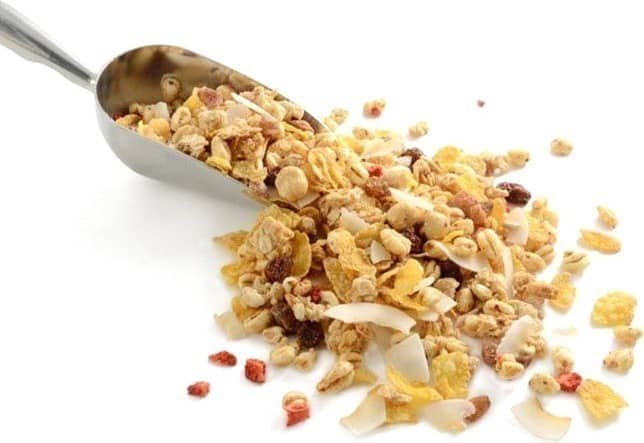 Fiocchi d'avena, fiocchi di frumento, zucchero, uvetta, riso croccante (farina di riso, zucchero, estratto di malto d'orzo, sale), olio di semi di girasole, mirtilli rossi, frumento duro soffiato, farina di riso, sciroppo di glucosio, cocco disidratato,