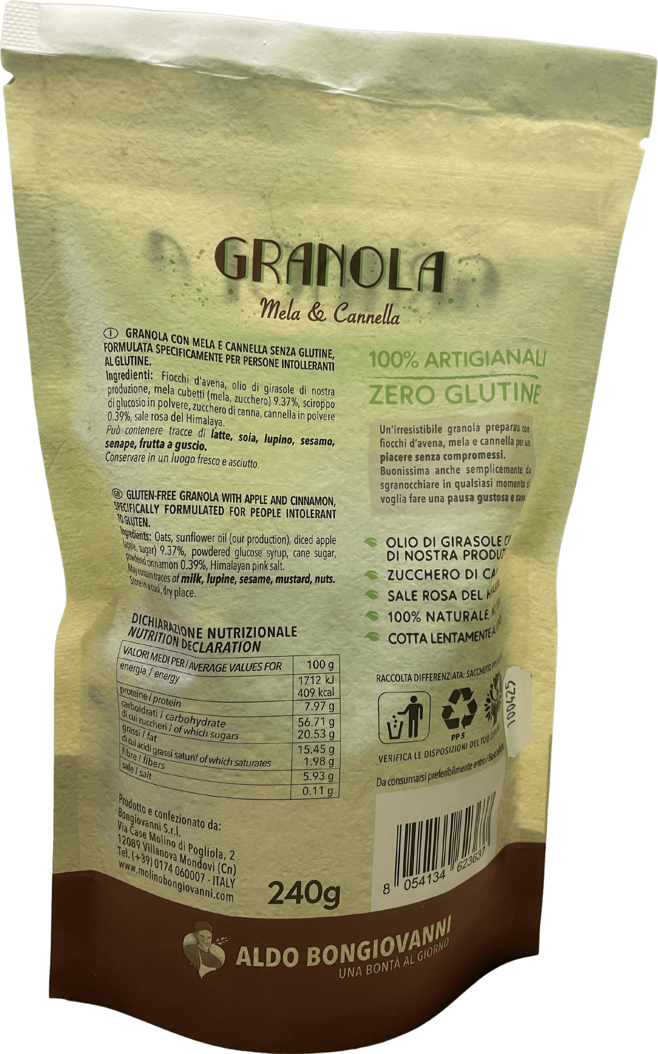 La Granola Mela & Cannella di Aldo Bongiovanni è pensata per chi cerca uno snack che coniuga sapore e nutrizione. Perfetta per chi segue una dieta senza glutine, risponde alla necessità di un alimento veloce ma sostanzioso, ideale per chi ha uno stile di vita dinamico.